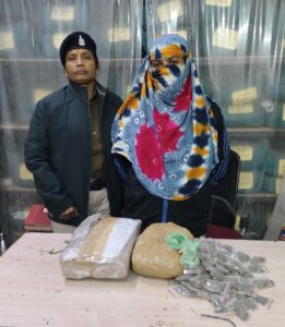 इसी तारतम्य में दिनांक 31.12.24 को एण्टी नारकोटिक्स टास्क फोर्स को सूचना प्राप्त हुई कि थाना तेलीबांधा क्षेत्रांतर्गत शताब्दी नगर शमशान घाट के बाउण्ड्री के पास 01 महिला अपने पास गांजा रखी है तथा बिक्री कर रही है। जिस पर वरिष्ठ अधिकारियों के निर्देशन में एण्टी नारकोटिक्स टास्क फोर्स, एण्टी क्राईम एण्ड साईबर यूनिट तथा थाना तेलीबांधा पुलिस की संयुक्त टीम द्वारा उक्त स्थान पर जाकर मुखबीर द्वारा बताये महिला को चिन्हांकित कर पकड़ा गया। पूछताछ में महिला ने अपना नाम रेणु कुल्हरिया निवासी तेलीबांधा रायपुर का होना बताया। टीम के सदस्यों द्वारा उसके पास रखे थैले की तलाशी लेने पर थैले में गांजा रखा होना पाया गया। जिस पर टीम के सदस्यों द्वारा महिला आरोपी रेणु कुल्हारिया को गिरफ्तार कर उसके कब्जे से 03 किलो 195 ग्राम गांजा जुमला कीमती लगभग 32,000/- रूपये जप्त कर महिला आरोपी के विरूद्ध थाना तेलीबांधा में अपराध क्रमांक 861/24 धारा 20बी नारकोटिक एक्ट का अपराध पंजीबद्ध कर कार्यवाही किया गया है।